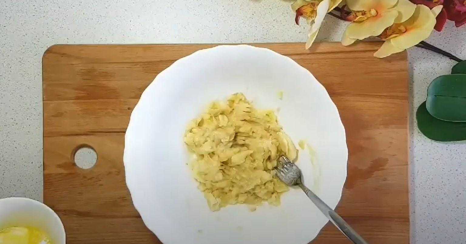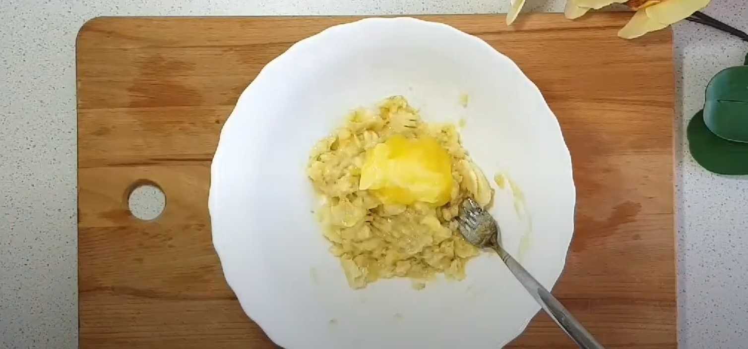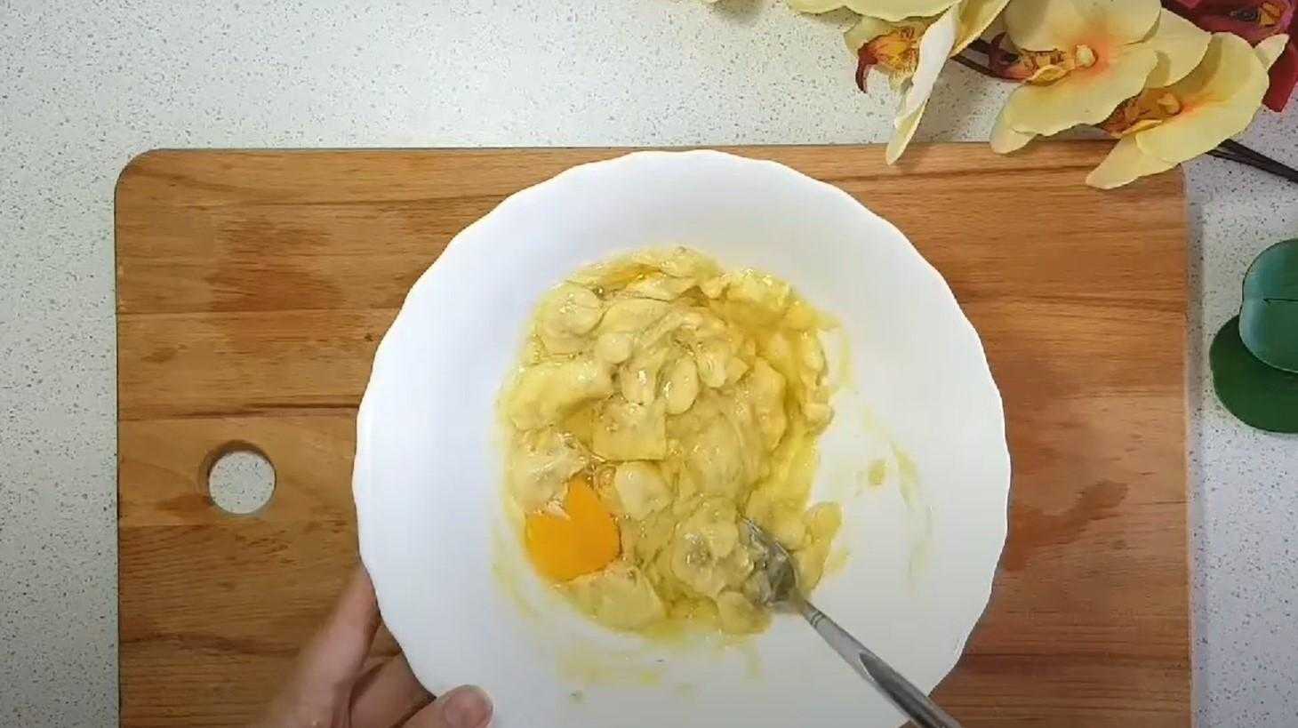2. Выкладываем бананы в глубокую миску и разминаем их вилкой вместе с куриными яйцами.