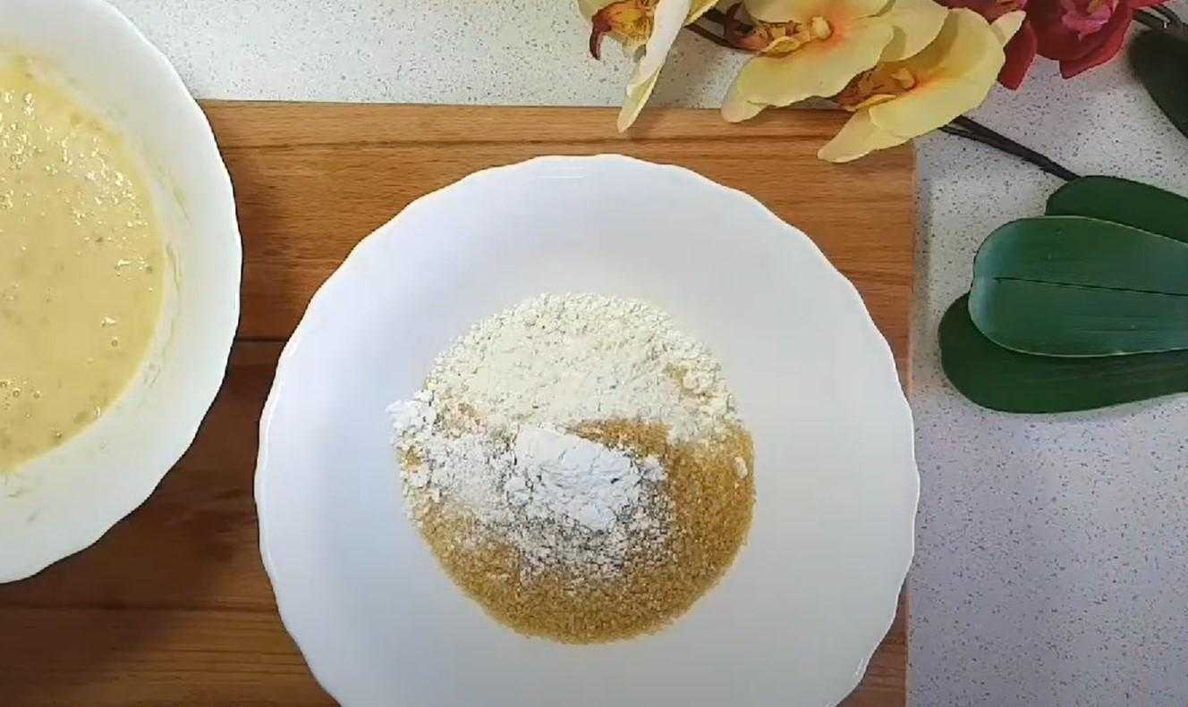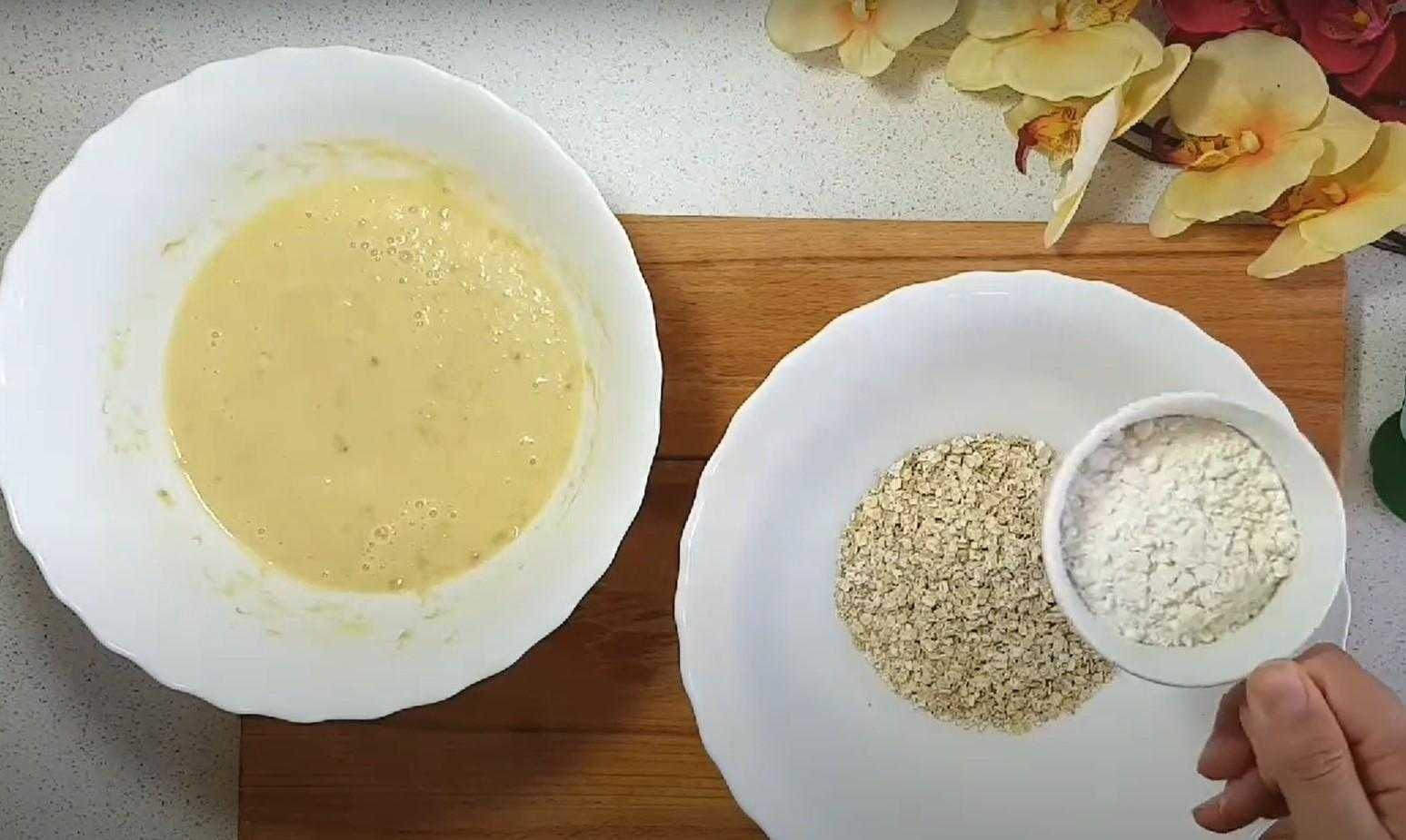 В отдельной посуде соединяем овсянку (долгой варки) и муку.
