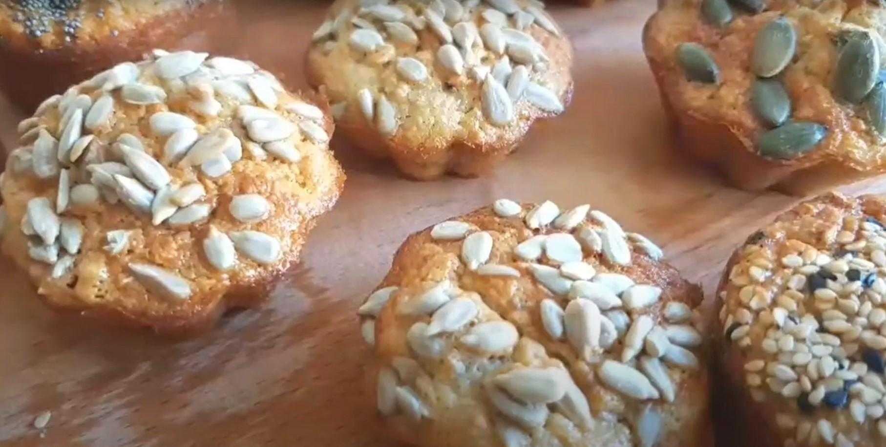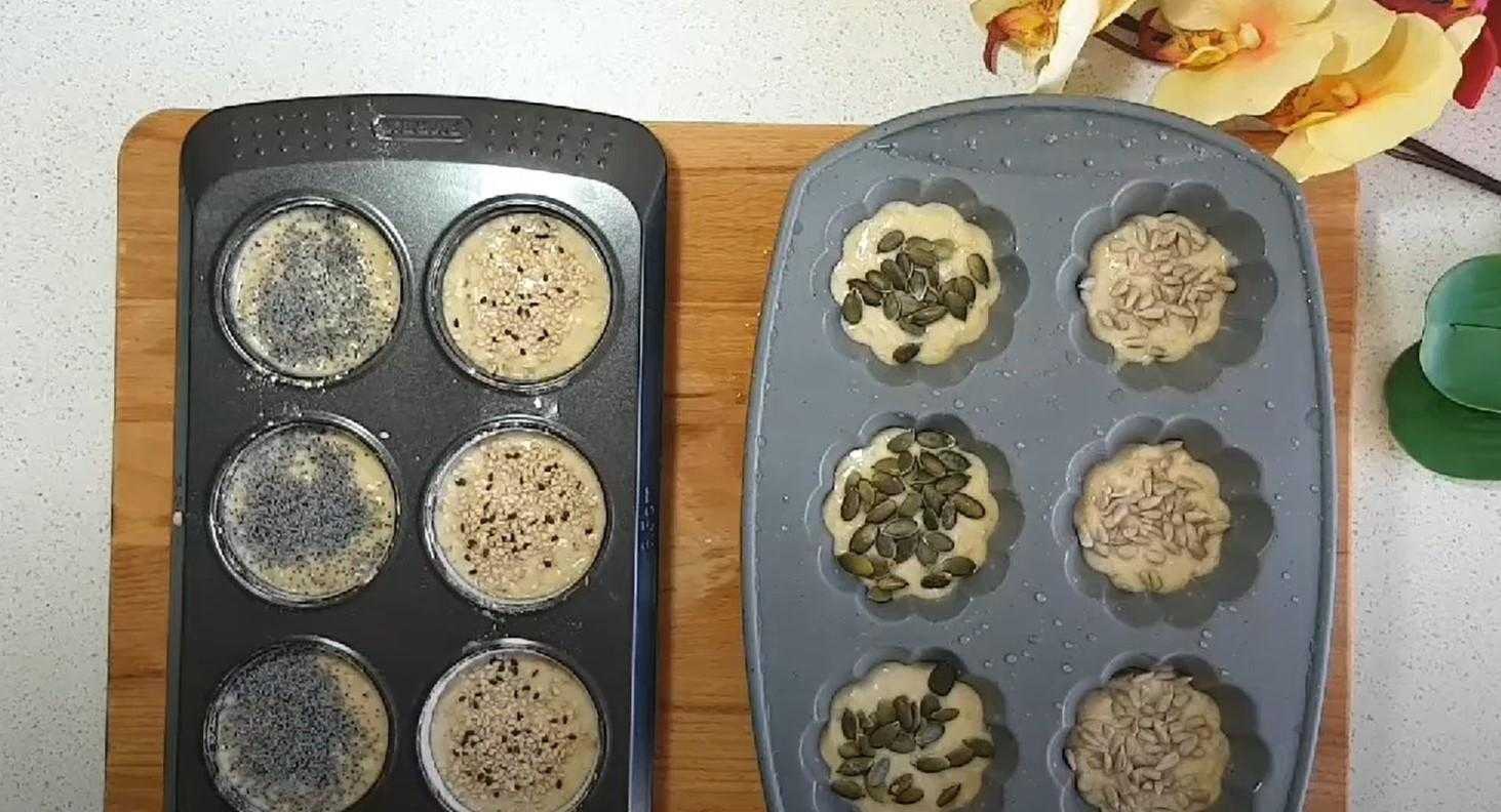 Раскладываем тесто в формы, заполняем не полностью, тесто подойдет. Сверху по желанию посыпаем семечками.