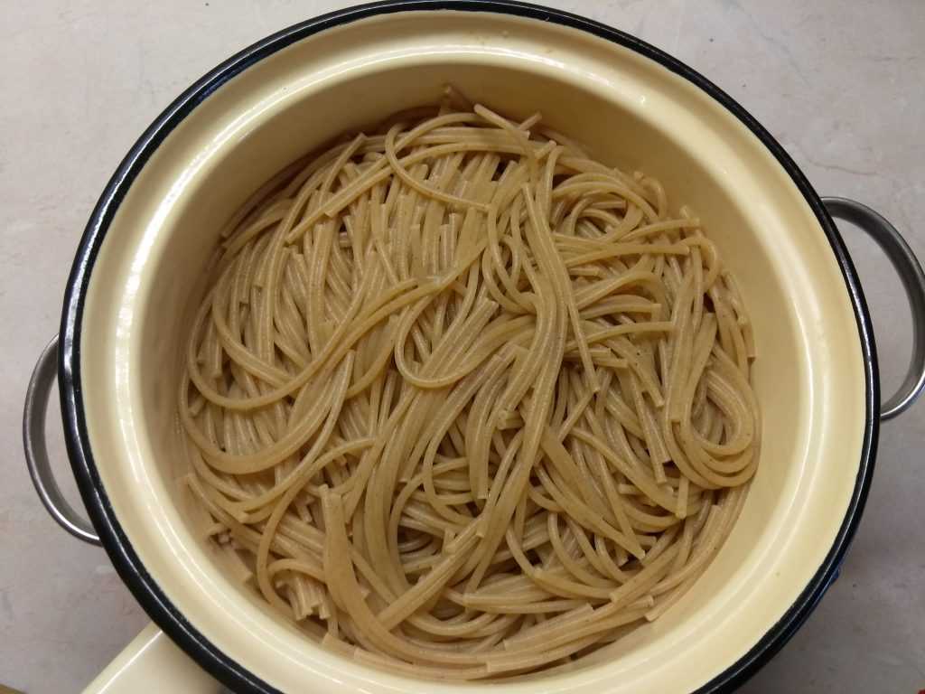 Тем временем наши макароны сварились. Откидываем их в дуршлаг, даем води стечь. Я не промываю макароны под краном, считаю не нужным это занятие, микробы нам тоже не нужны.