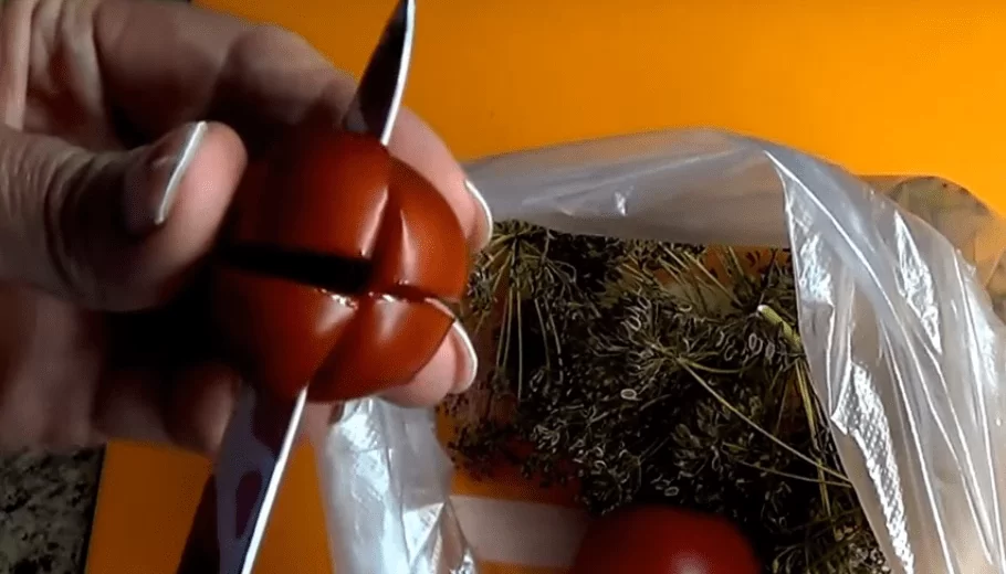 - Помидоры помойте, удалите плодоножки и сделайте крест на крест надрез сверху на каждом помидоре. В полиэтиленовый пакет положите зонтик укропа, далее положите помидоры;
