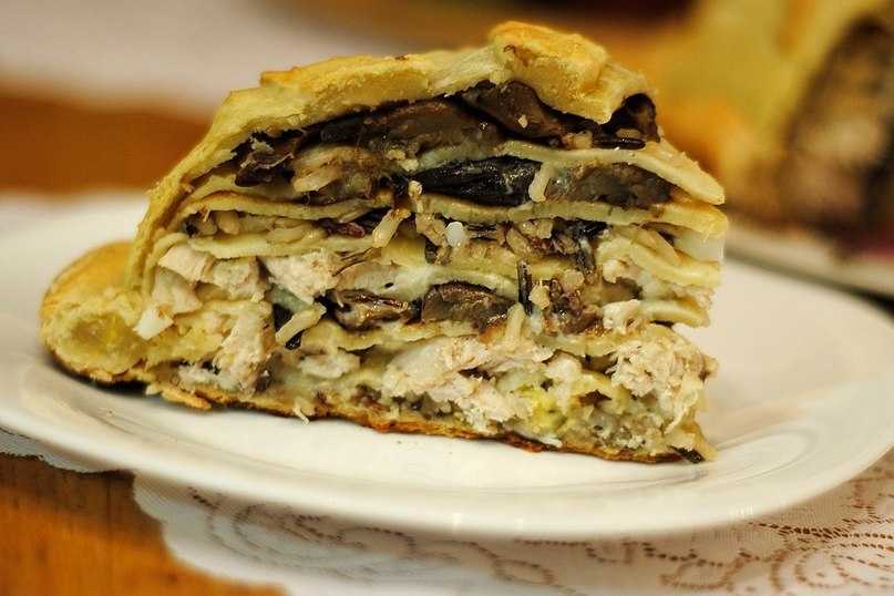 - Четверть теста (¼) раскатать в лепешку (по размеру блина). Выложить начинку, чередуя с блинами. Накрыть большой лепешкой теста (¾). Сделать отверстие в центре, смазать желтком.