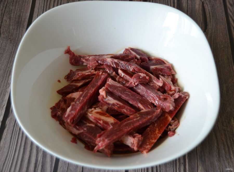 - Тщательно промойте мясо, обсушите, порежьте на тонкие брусочки (5*7).