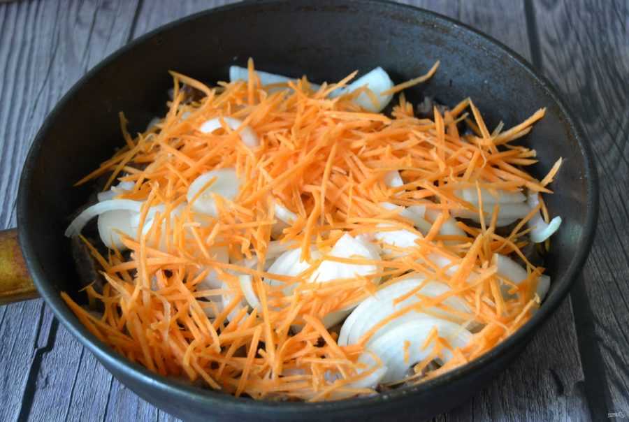 Добавьте лук и морковь, продолжайте обжаривать примерно 5 минут.