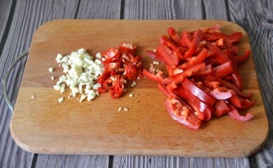 Мелко нарежьте чеснок, острый перец чили, нарежьте полосками болгарский перец.