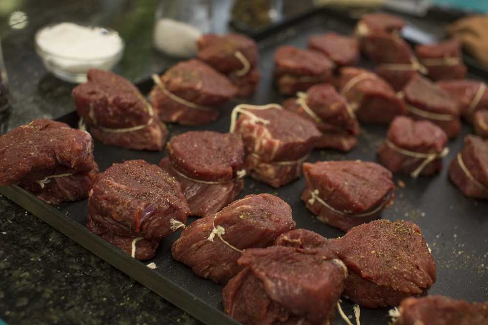 - Разделите кусок поперек волокон. Придайте кусочкам овальную форму. Частенько стейки во время термической обработки теряют форму. Скрепите заготовки бечевкой, перевязав поперек волокон.