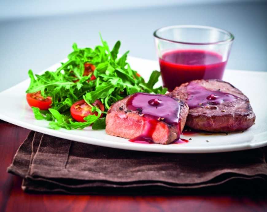 Сковороду смазать оливковым маслом, медальоны натереть солью и перцем, а затем выложить обжариваться на высоком огне. Каждую сторону следует готовить в течение четырёх минут до появления корочки. Форму для выпекания застелить фольгой и переложить туда мясо. Отправить в духовку на двадцать минут при температуре 185 градусов. Готовое блюдо полить ягодным соусом.