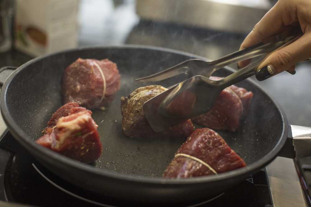 Ставим на огонь сухую сковороду, разогреваем ее. Затем добавляем пару ложек растительного масла. Прогреваем масло. Теперь обжариваем наши медальоны со всех сторон. Переворачиваем с помощью щипцов. На каждой стороне держим секунд 20-30. Чтобы мясо прожарилось равномерно, понадобится где-то семь переворотов (пять по окружности, верх и низ).