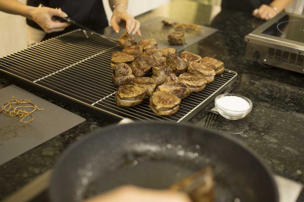Здесь есть важное правило — кусочки нельзя поворачивать, пока низ зажарится, если потревожить мясо, то нижние волокна порвутся и вытечет ценный сок, в итоге стейк станет сухим. Для приготовления мяса требуется вдвое меньше времени, чем для больших стейков.