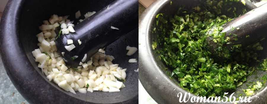 Мелко нарежьте все дольки чеснока и постепенно, засыпая рубленную зелень небольшими порциями, необходимо растолочь ее в ступке.
