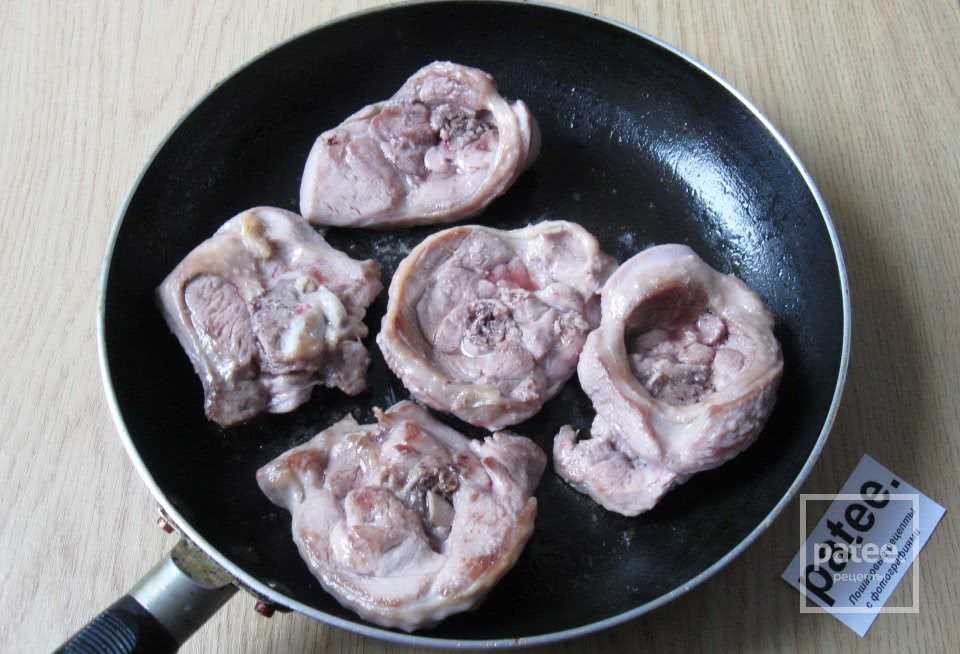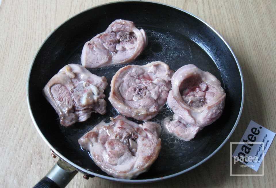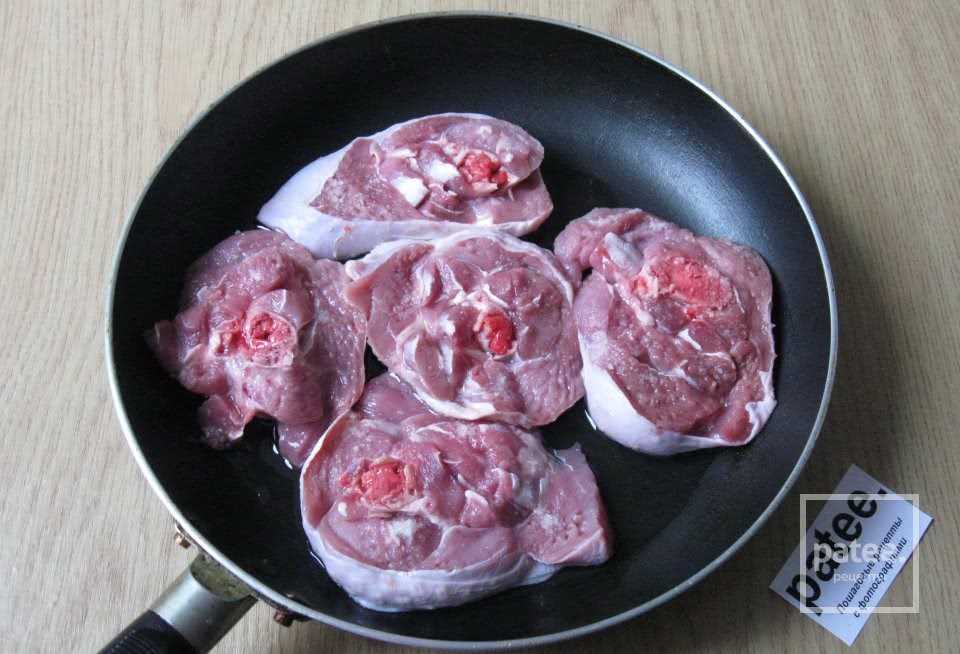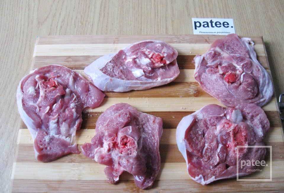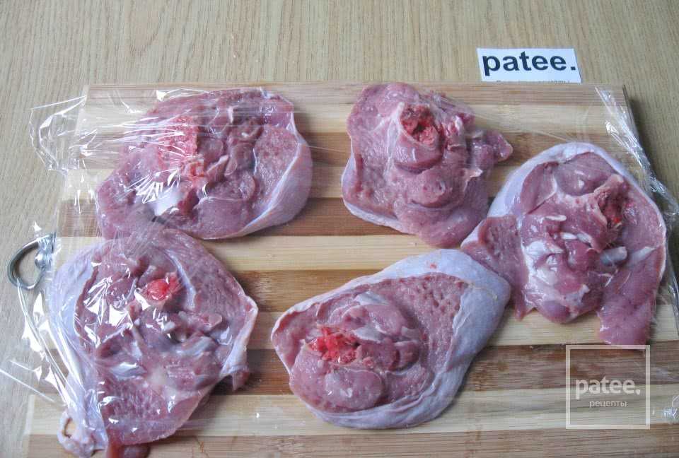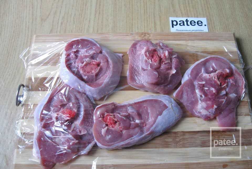 - мясо тщательно промываем, обсушиваем и нарезаем круглыми пластинками толщиной около сантиметра;