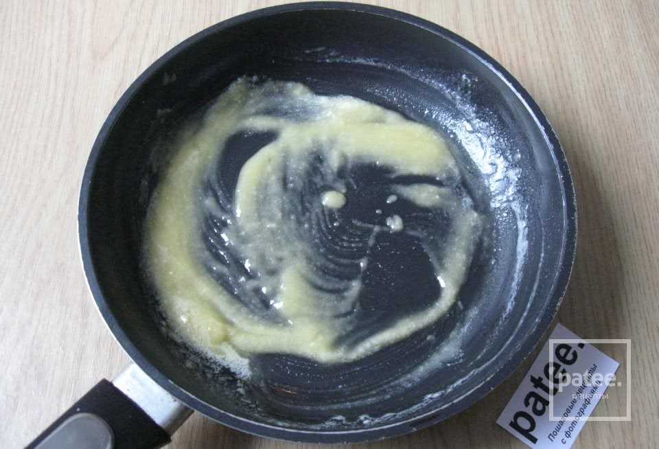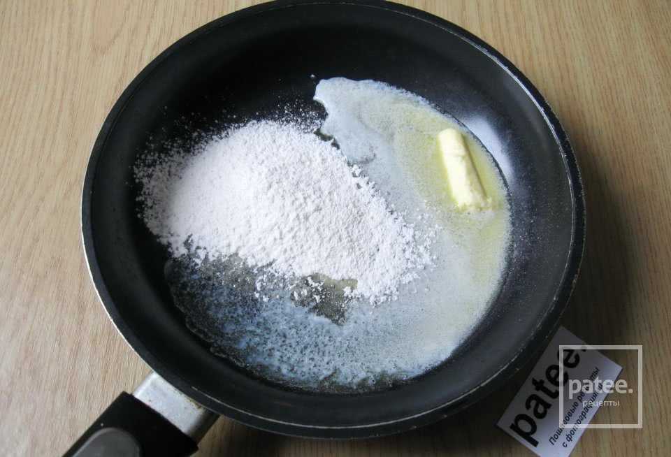 Приступаем к приготовлению соуса. На горячую сковородку кладем сливочное масло и муку.