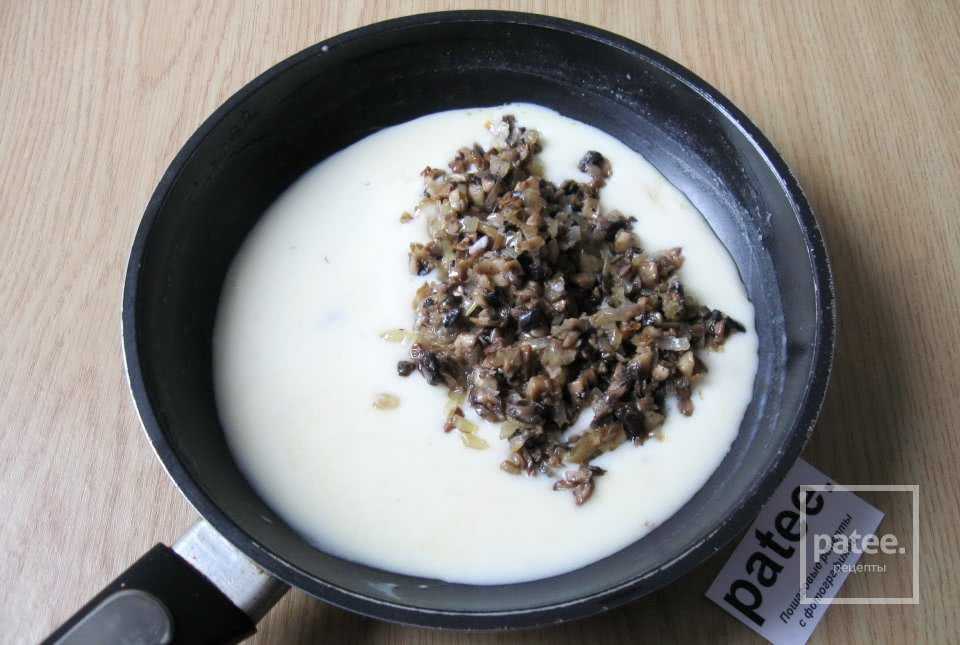 В полученный густой соус кладем обжаренный лук с грибами. Солим и перчим по вкусу, перемешиваем.