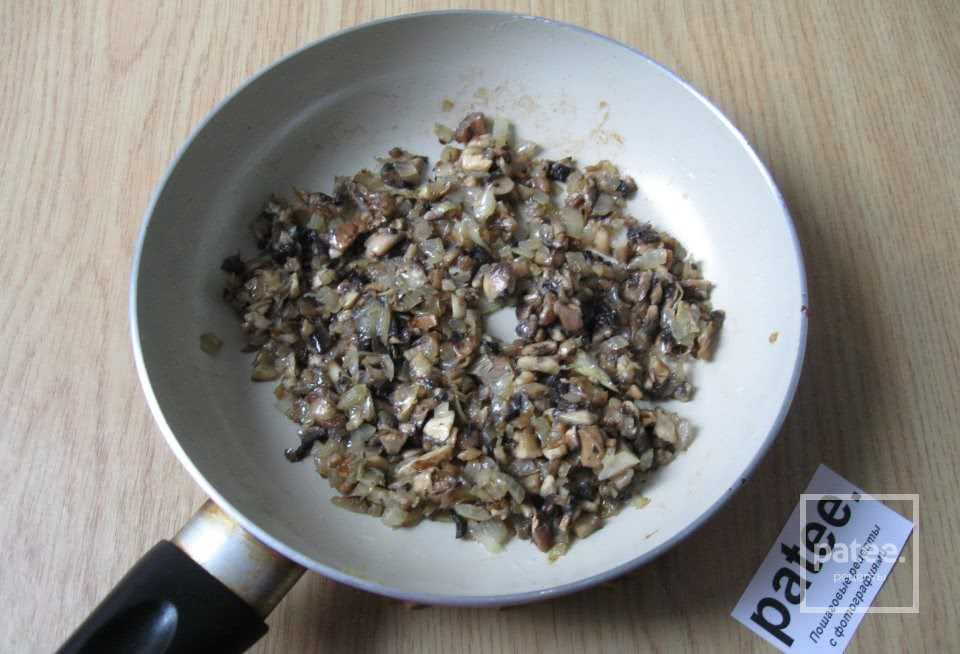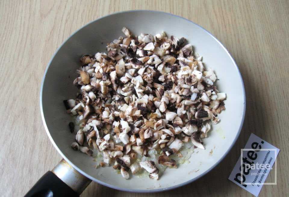 Шампиньоны мелко нарезаем и добавляем на сковороду к обжаренному луку.