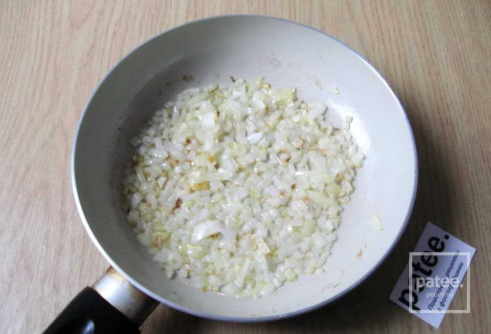 - Обчистите и порежьте кубиками 200-250 г лука. Обжарьте его до прозрачности на масле, которое осталось после индейки. Это займет около 3-5 минут.