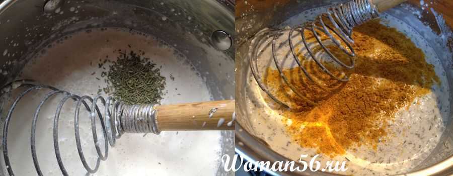 Добавляем розмарин, карри и хмели-сунели. Все хорошо и непрерывно мешаем. Примерно 10 минут, не доводя до кипения.