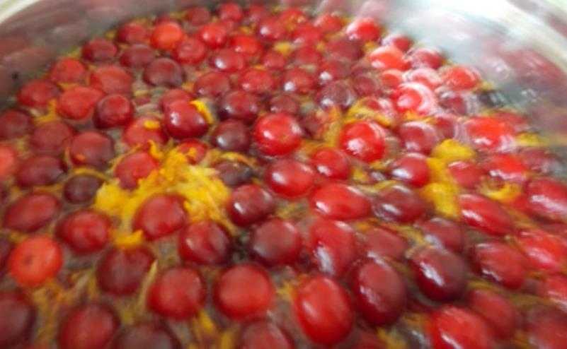 Клюкву вымыть, засыпать сахаром. Добавить воду и апельсиновую цедру, дать закипеть.