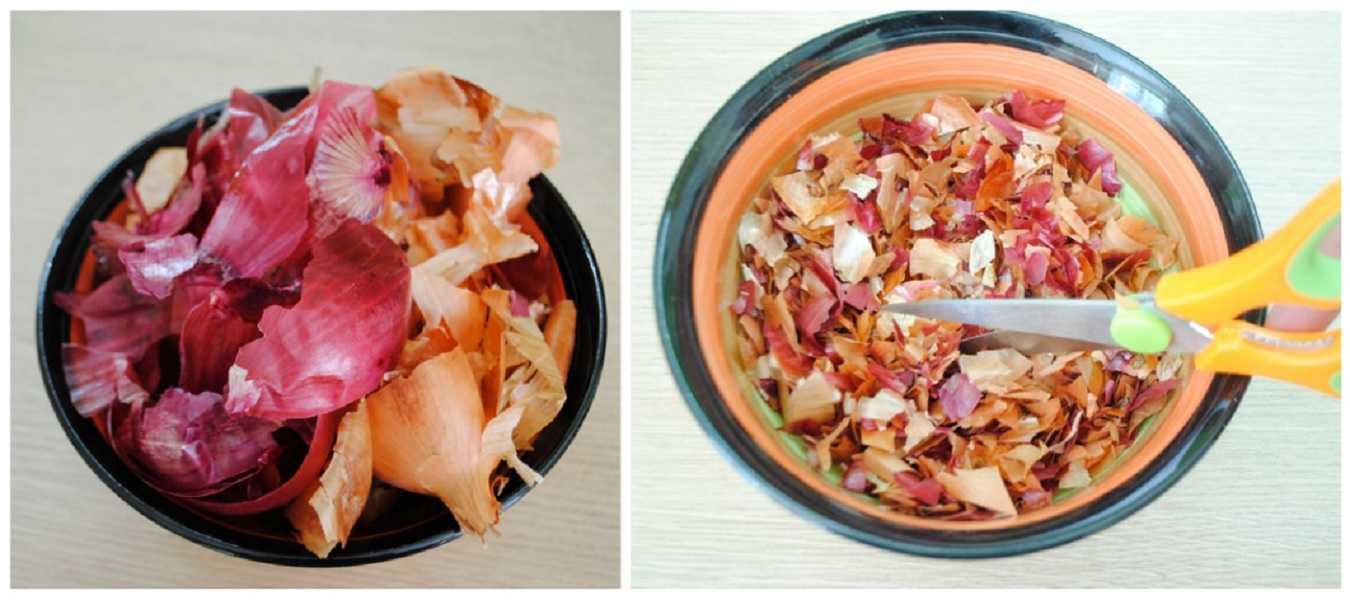 Затем следует подготовить луковую шелуху. Лучше всего, если она будет разного цвета (от красного и желтого репчатого лука). Ее необходимо мелко измельчить, чем меньше будут кусочки, тем мельче получится рисунок.