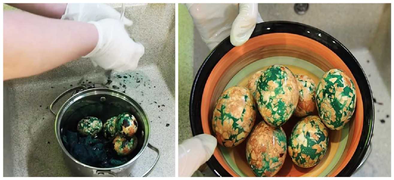 После варки кастрюлю ставят в раковину, включают воду и ждут, пока проточная вода, наполнит кастрюлю и, стекая, не посветлеет. После этого можно выключить воду и слить остатки жидкости. Это следует делать исключительно в перчатках. После яйца разворачивают и очищают от шелухи, промывают и выкладывают на тарелку обсохнуть.
