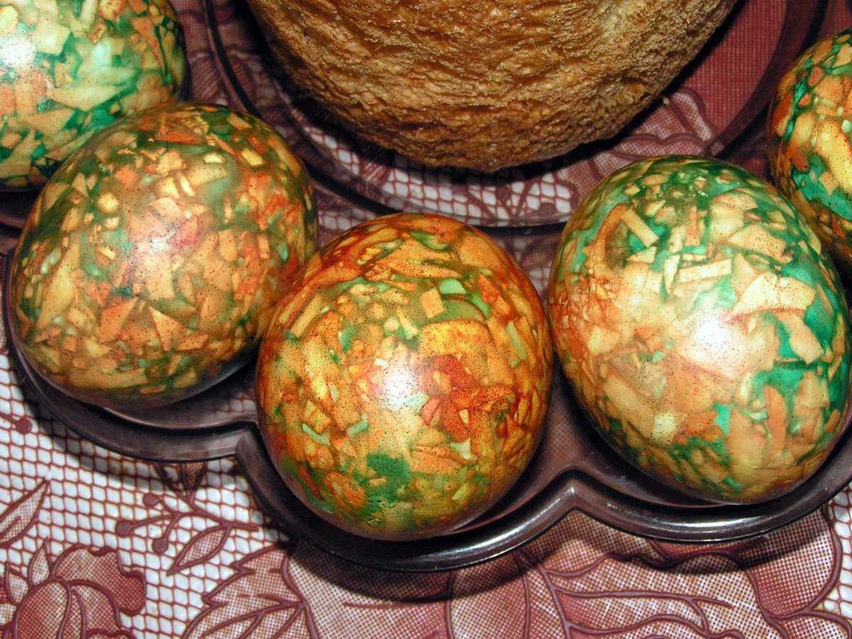 Из подручных средств получается изящный рисунок, напоминающий мраморную расцветку. Для этого варианта тоже нужна шелуха, так что запасайтесь ею заранее.