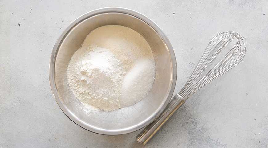 Смешайте в миске венчиком муку, манку, разрыхлитель, соль и сахар.