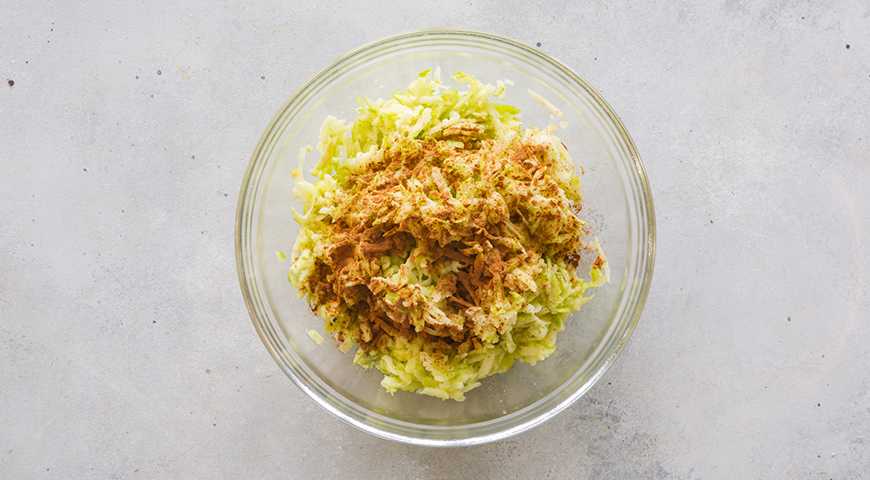 Яблоки натрите на крупной терке. Смешайте с корицей.