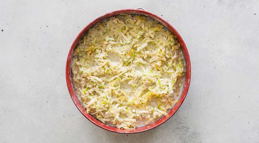 - На дно разъемной формы для запекания положить пергамент, бока хорошо промазать маслом. Выкладывать компоненты пирога слоями в такой последовательности:
