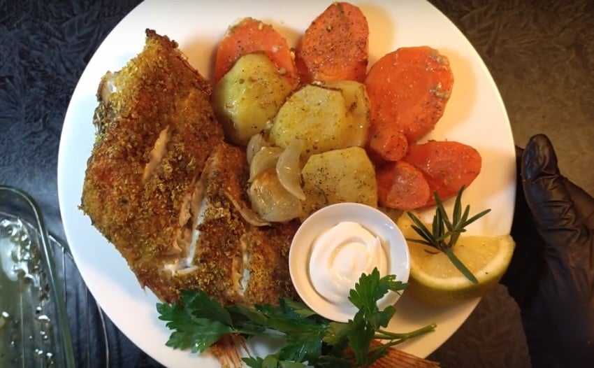 5. Окуня запанируйте в сухарях и сложите на овощную подушку. Сверху полейте его растительным маслом. Запекайте при 180 градусах в течение 30 минут.