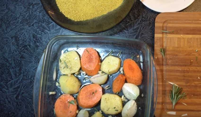 4. Форму для запекания смажьте маслом. Сложите овощи в форму, сверху посыпьте розмарином и мелко нашинкованным чесноком.