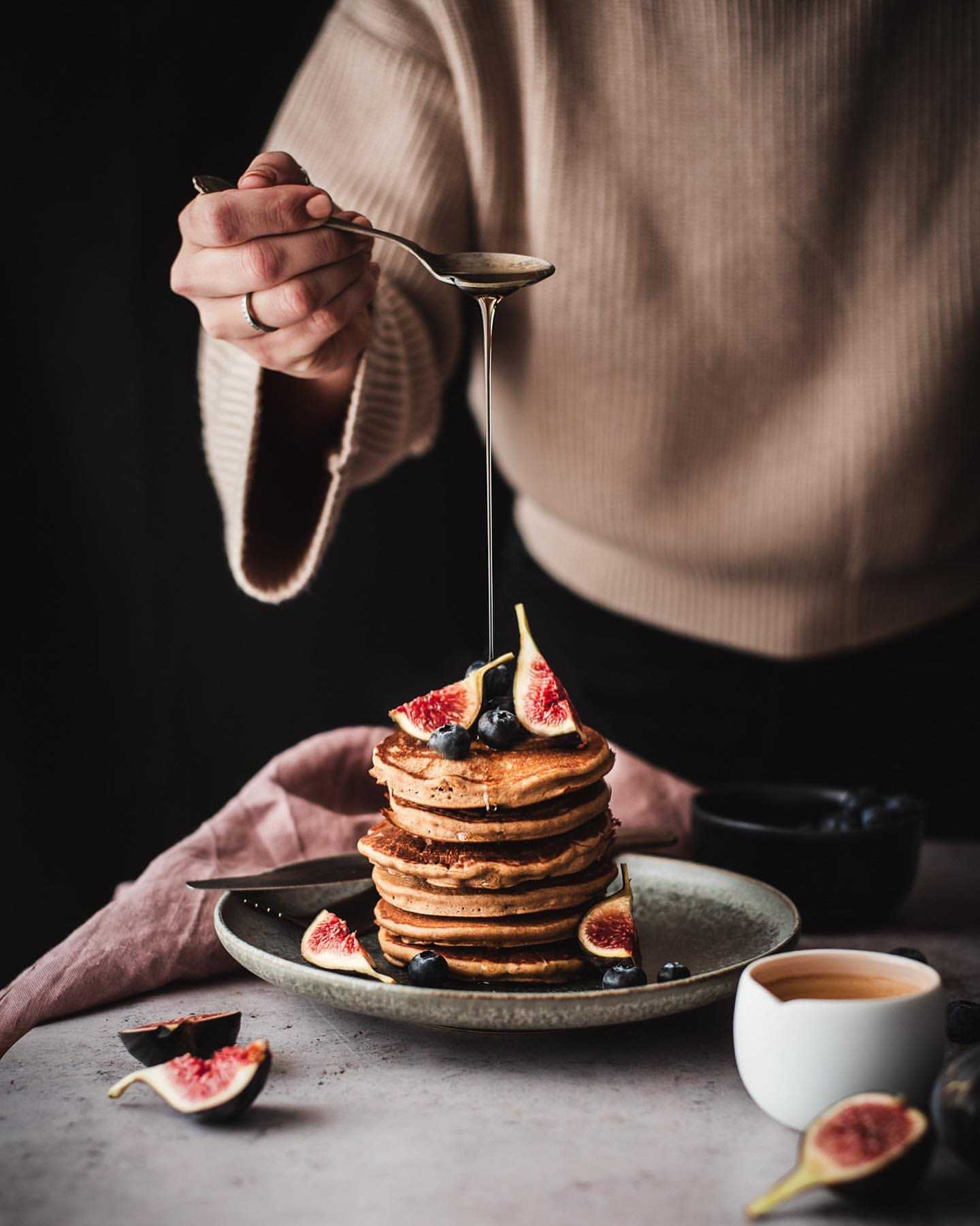 Готовые пп оладьи на ряженке с овсяной мукой можно подать с ягодами, сливочным йогуртом или медом.
