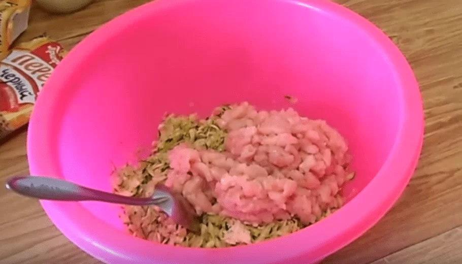 - В полученную массу добавить 2 столовые ложки отрубей, кабачки и курицу