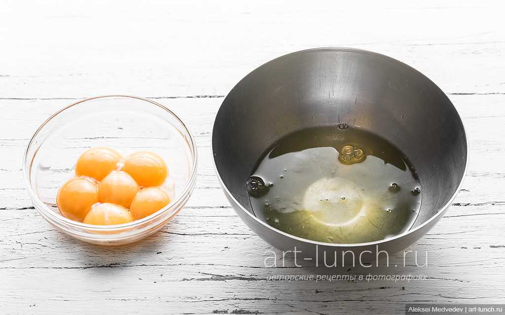 Для начала необходимо отделить белки от желтков. Желтки выложить в небольшую мисочку, а белки поместить в емкость для взбивания с высокими бортами. В емкость к белкам добавить щепотку соли и на маленькой скорости начать взбивать. Когда структура белков разрушится, необходимо начать постепенно увеличивать скорость работы миксера. Когда белки начнут белеть и принимать стойкую форму, добавить сок дольки лимона и взбивать еще в течение 2 минут.