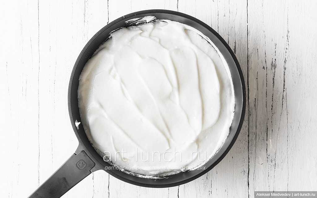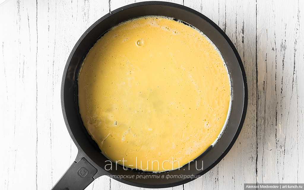 - Как только желтковый «блин» схватится, ложкой выложить на него белковую массу и равномерно распределить с помощью лопатки по поверхности.