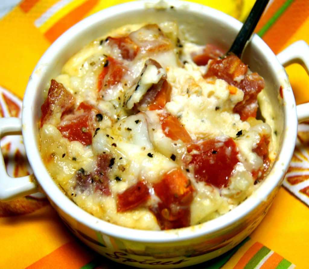 В этом случае у меня со вчерашнего дня оставалась отварная курица (грудка , около 100 гр.) и макароны (ракушки, примерно в таком же количестве). Яйца, в таком случае мне хватает одного, а молока пара столовых ложек.