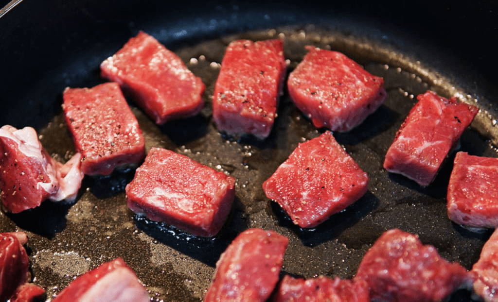 Нарезать мясо стоит кусочками приблизительно 3*4 см, что является достаточно большим размером. Во время жарки и тушения мясо уменьшается в размерах.