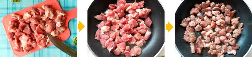 - В сковородке на постном масле обжарить кубики мяса до полуготовности. Выложить его в другую посуду для дальнейшего приготовления. Нарезанную морковку и картошку жарим до румяной корочки на той же сковородке.