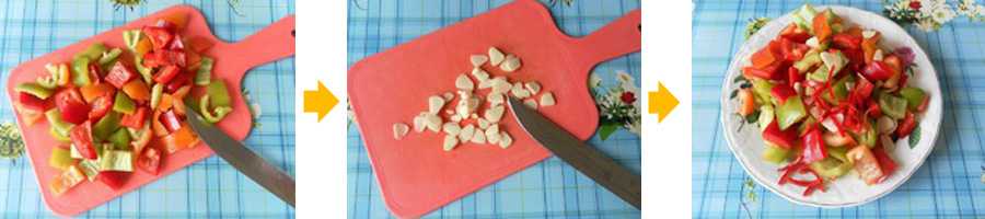 6. Очищенный от семян болгарский перец нарезаем кубиками – не слишком крупно, но и не мелко.