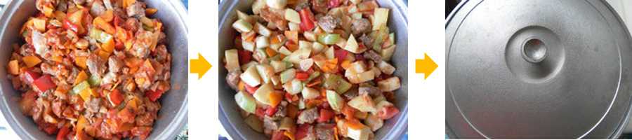 11. На потушенные с мясом овощи ровным слоем выкладываем картошку. Сверху также равномерно распределяем кабачки.