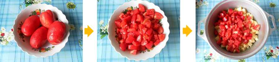 - Помидоры промываем под проточной водой, удаляем плодоножки и делаем крестообразный надрез на верхушке. Обдаем овощи кипятком и сразу же окунаем их в холодную воду – так легче снять кожицу. Нарезаем мелкими кубиками.
