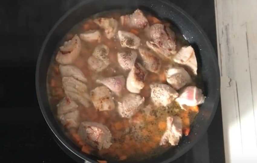5. Затем поджарку посолите и поперчите, влейте в сковороду чуть меньше половины стакана воды и потушите еще минут 20.