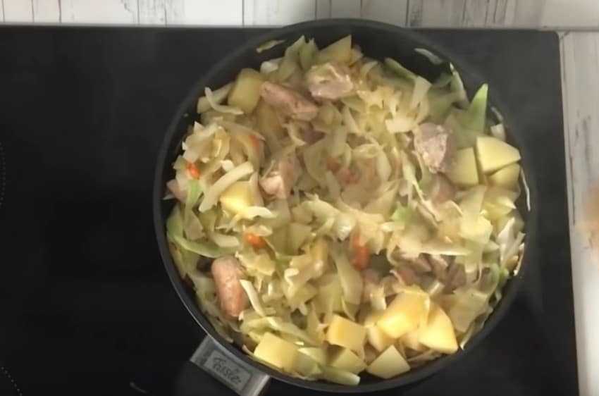 7. В сковороду добавьте картошку и капусту, досолите и доперчите по вкусу. Все как следует перемешайте. Содержимое сковороды потушите еще минут 5.