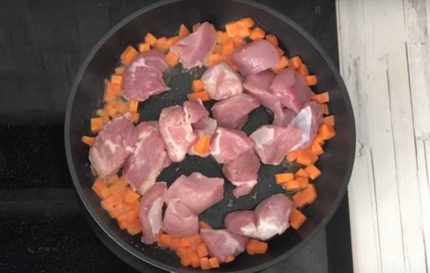 4. На сковороду к моркови выложите мясо и обжаривайте все вместе еще около 10 минут.