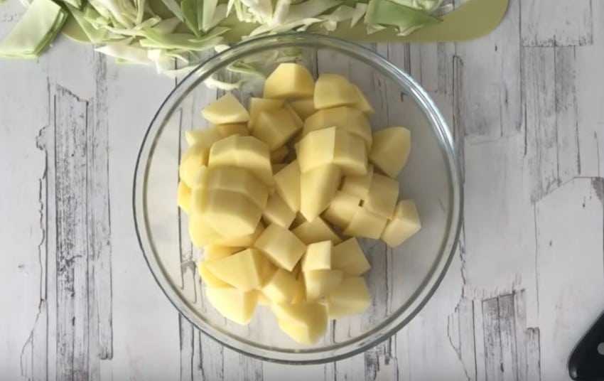 - Затем очистите картофель, измельчите кубиками и отправляйте ко всем ингредиентам сразу после кабачка.