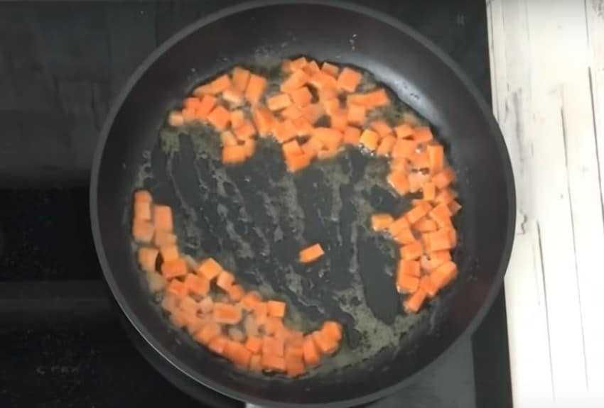 3. Морковь натрите на крупной терке или нарежьте мелким кубиком. Обжарьте на масле пару-тройку минут.