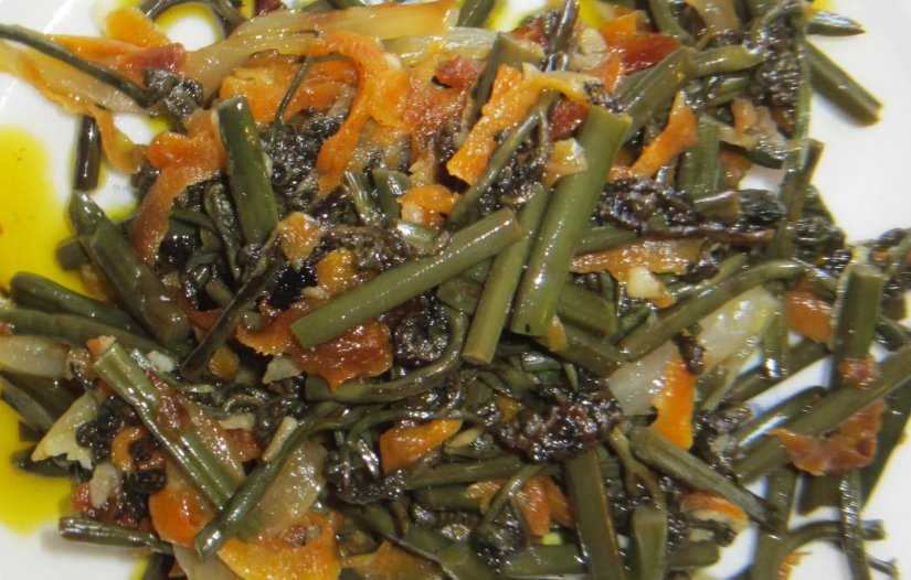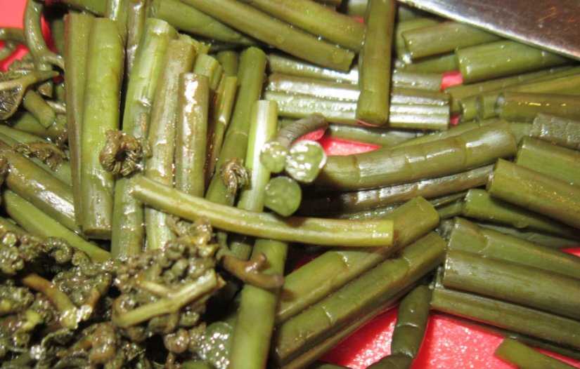 - Вымоченные побеги порежьте, отварите в течение трех минут. Слейте воду и обсушите.