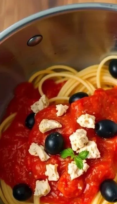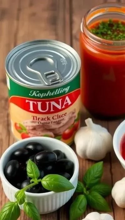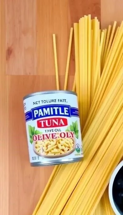 - Добавление тунца и оливок: Слейте жидкость из консервированного тунца и добавьте его в сковороду. Добавьте оливки. Перемешайте и прогрейте все вместе в течение 2-3 минут.