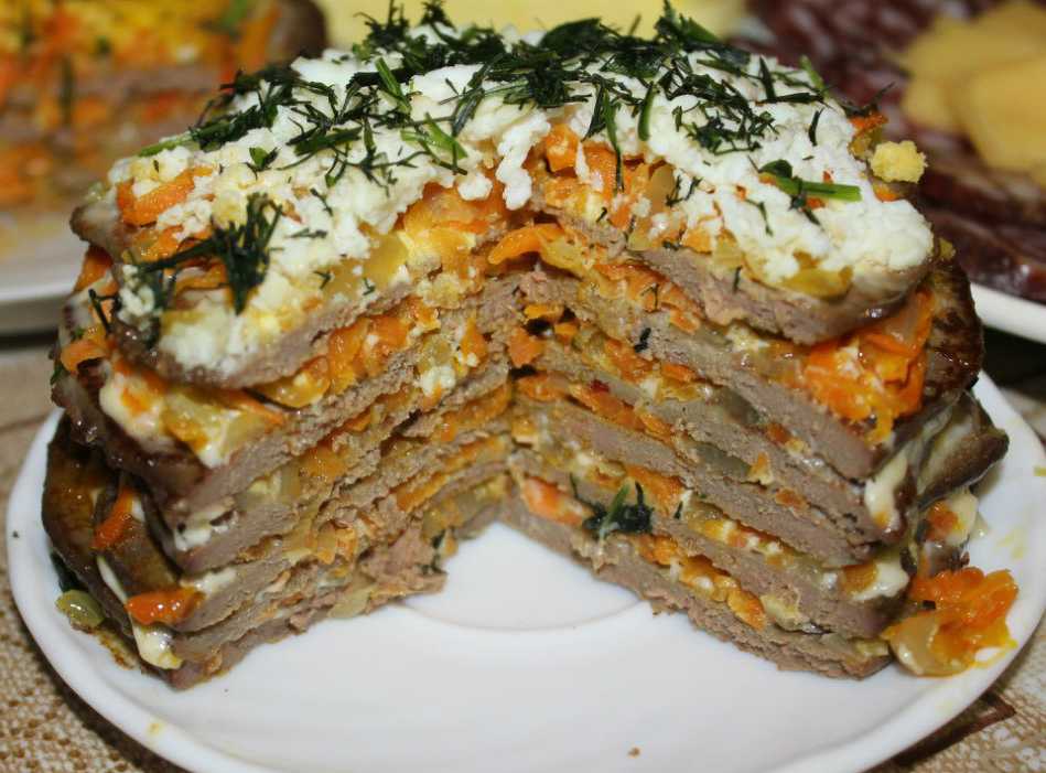 Печеночный торт с морковью и луком