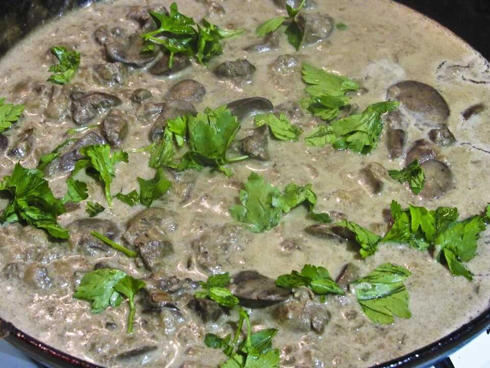Индюшиная печень в сметане и с белыми грибами