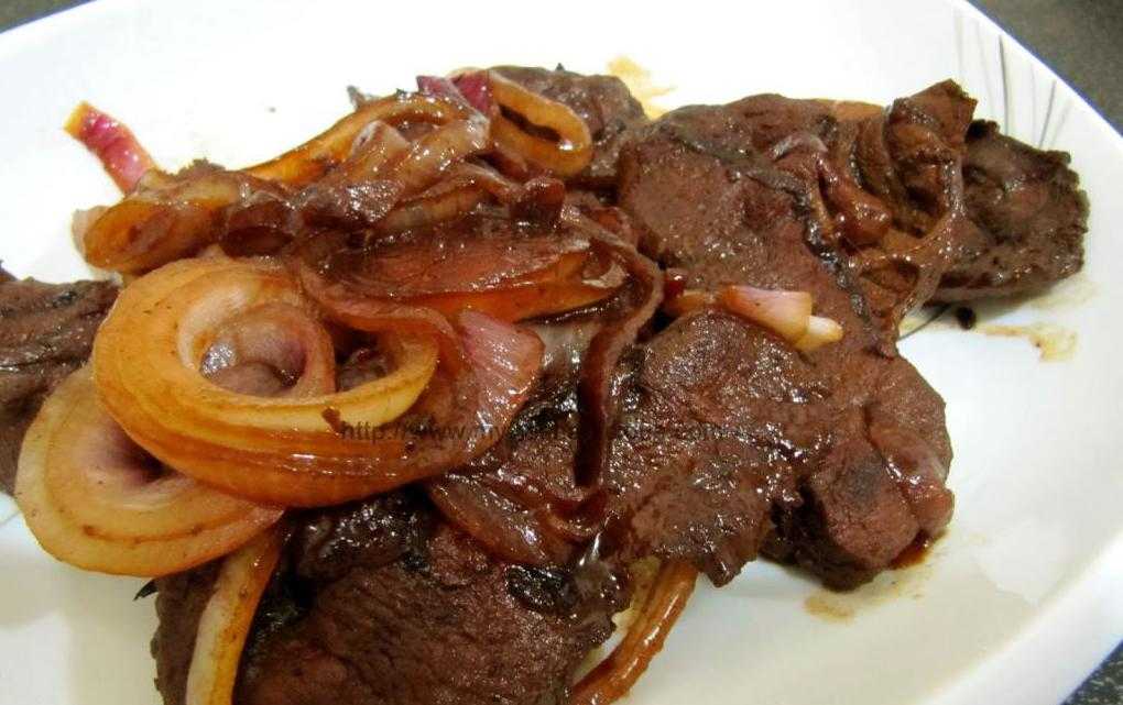 - Печенка промывается ледяной водой, режется средними кусочками и обжаривается на раскаленном масле.
