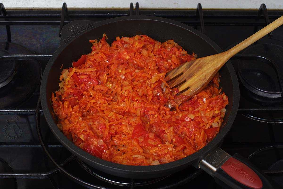 Шаг 1. Для начала подготовьте зажарку. На сковороде обжарьте мелко нарезанный лук (половину луковицы) и натертую морковь. Добавьте туда мелко нарезанный помидор и немного воды. Готовьте так пять минут.